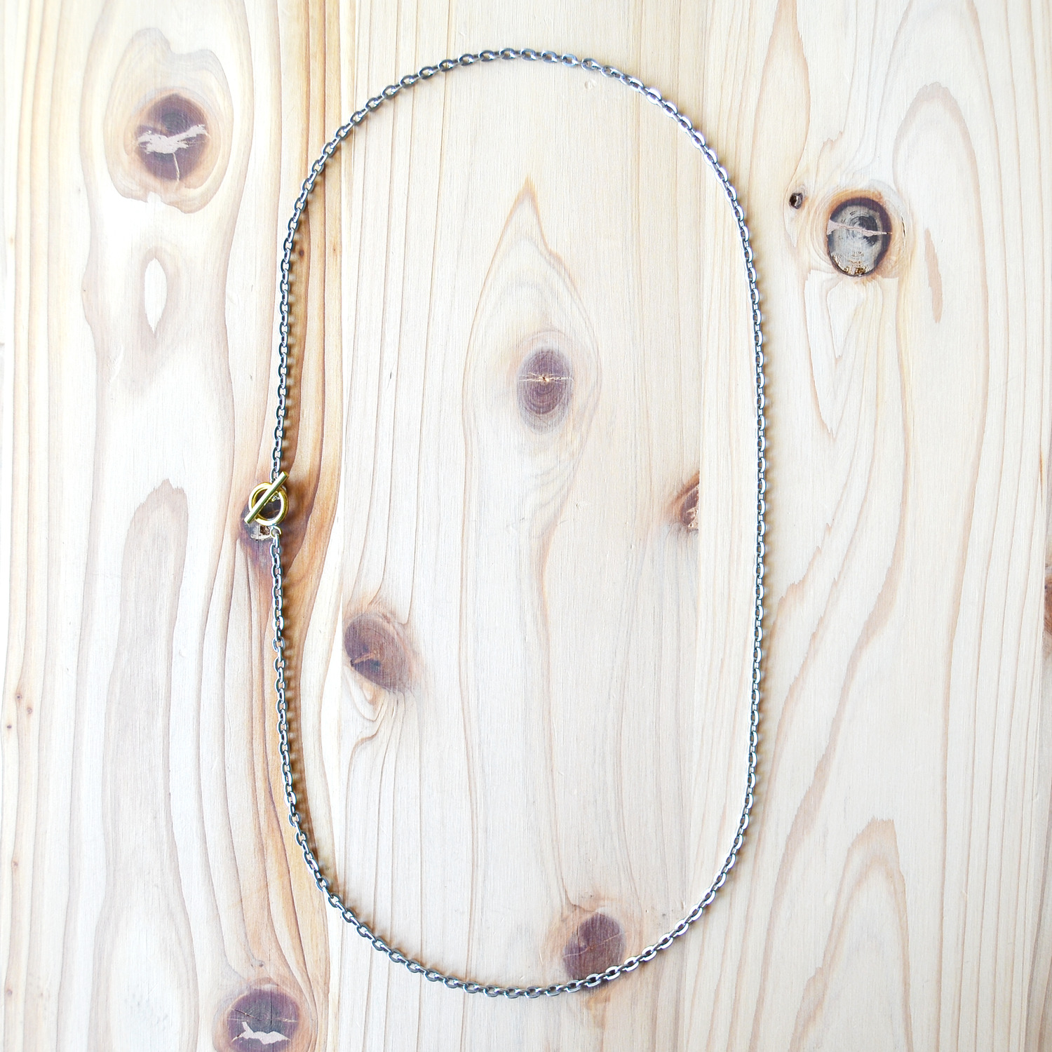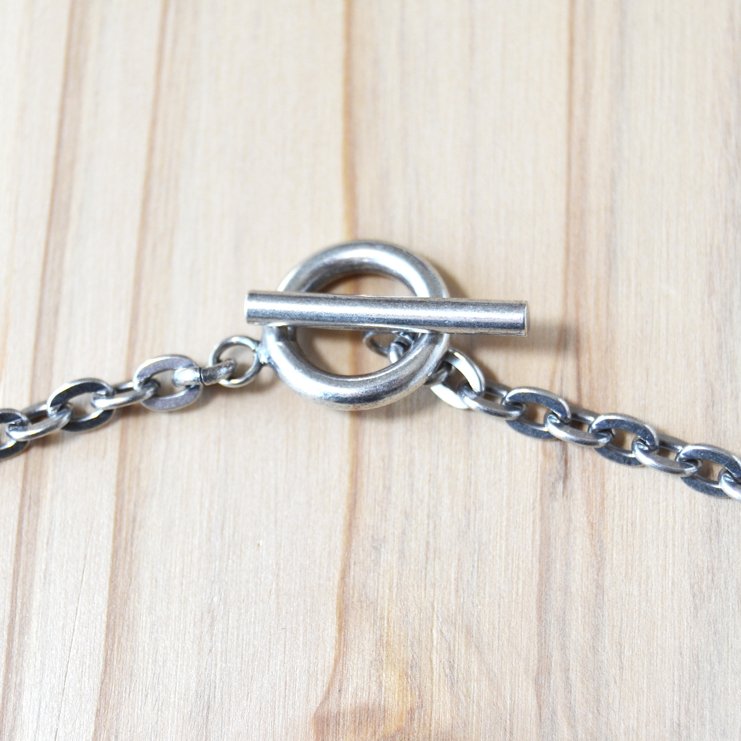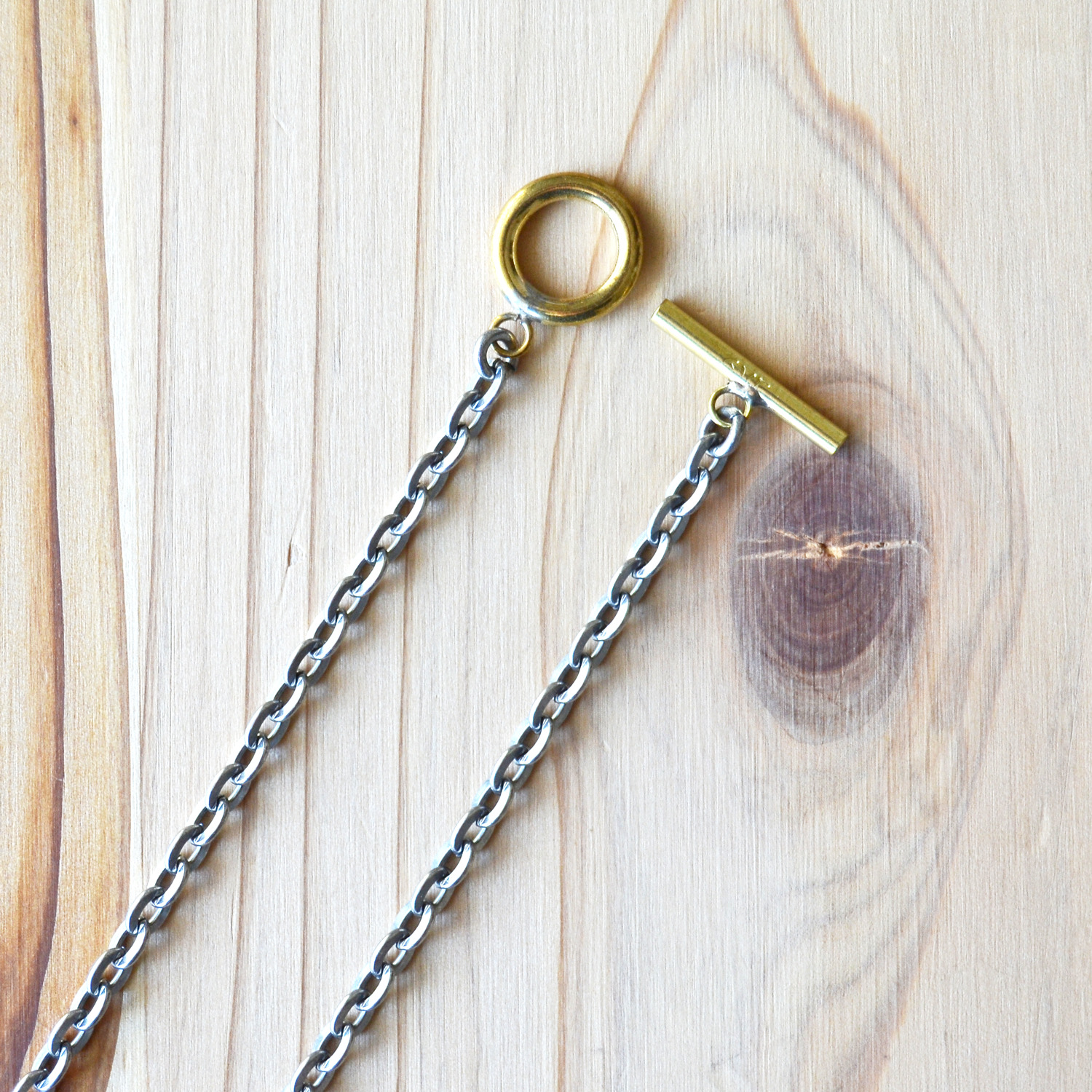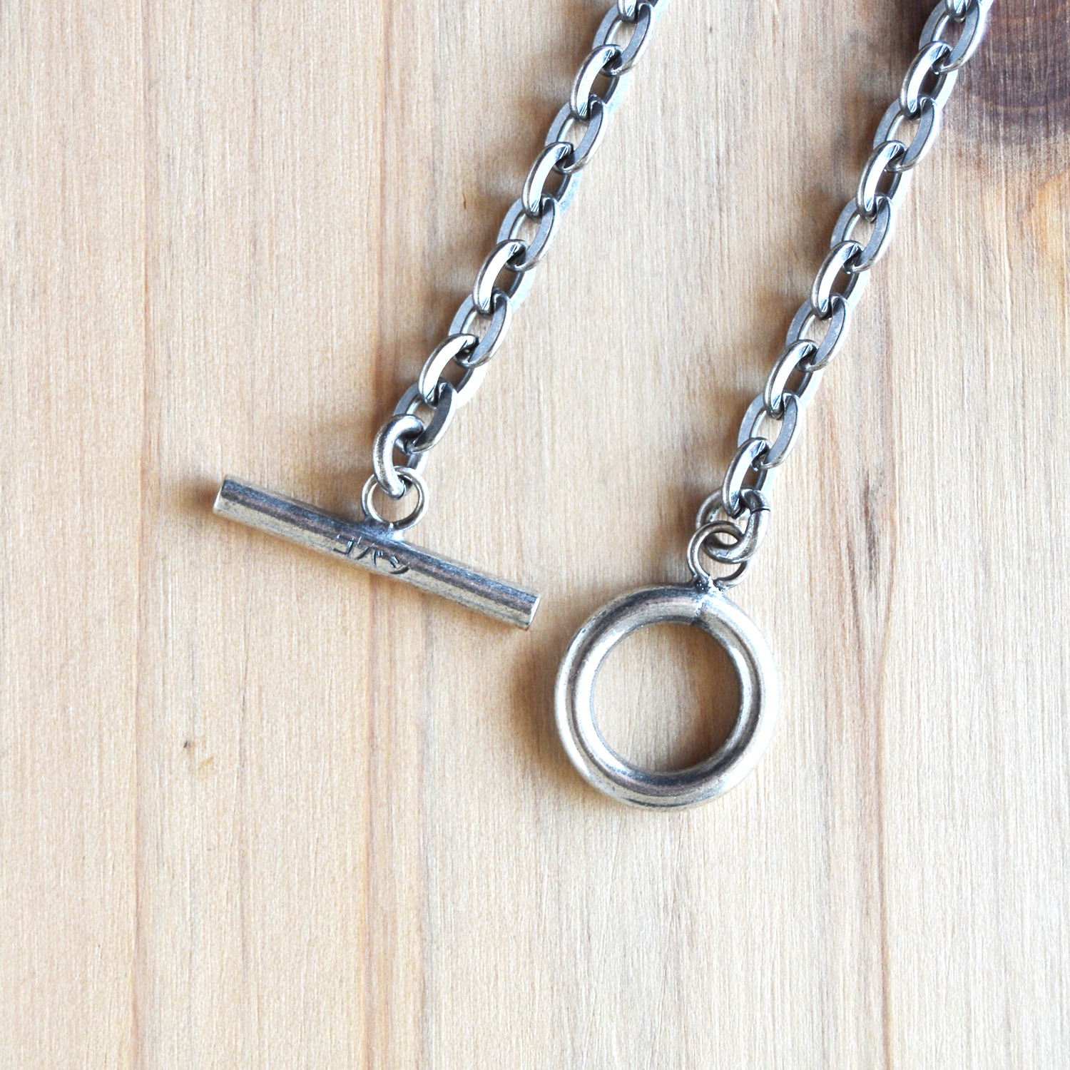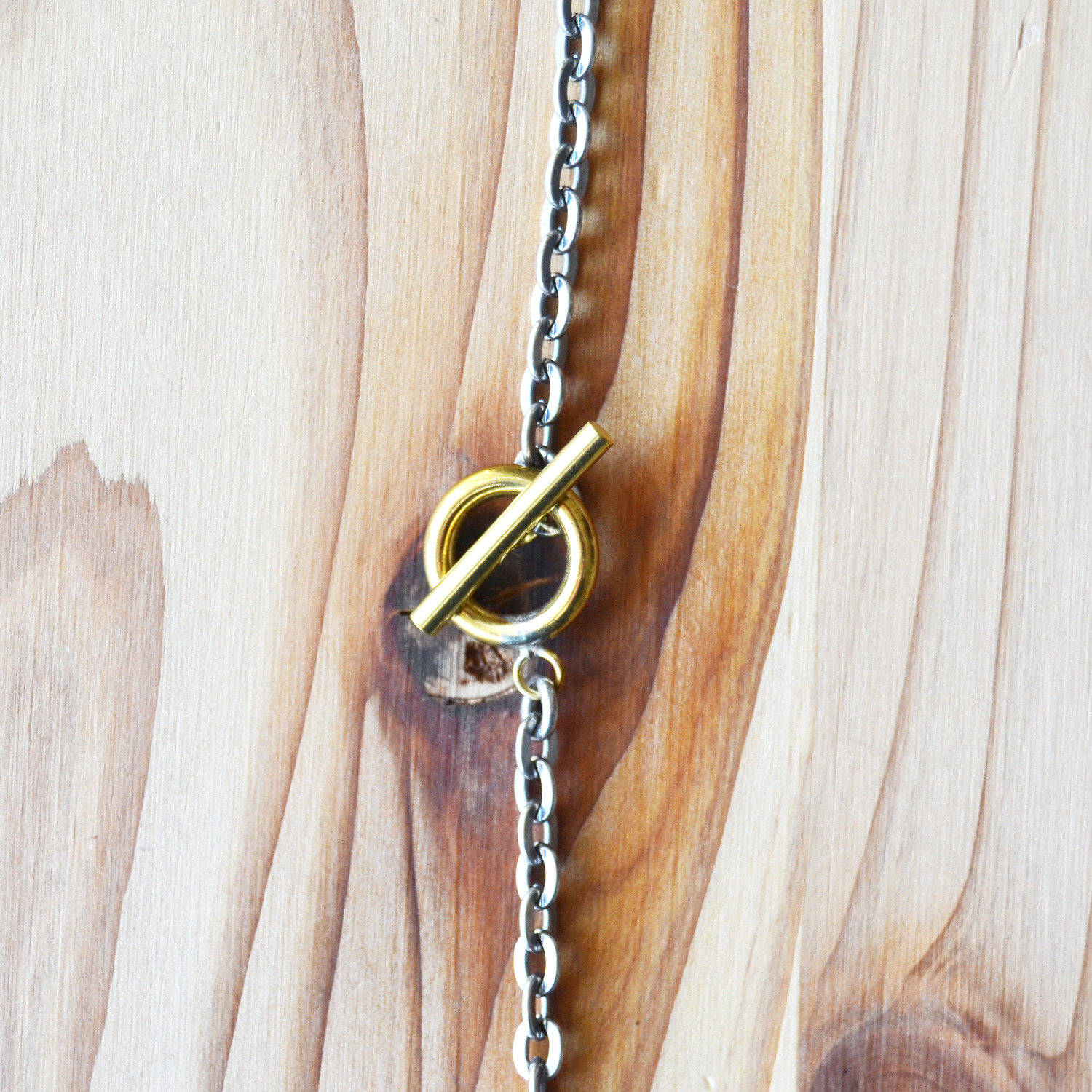 The clasp is a toggle style. Both the ring and bar are hand-brazed one by one, giving each piece a slightly unique character. The standard clasp is solid brass, but a silver-plated clasp is also available as an option.